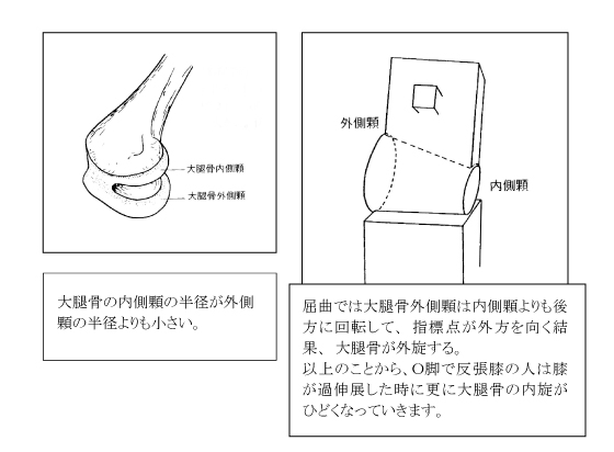 O脚の方は大腿骨・下腿骨を内旋させて足関節を外転させて歩行しているため、足関節が外転し捻れた状態で固まっています。